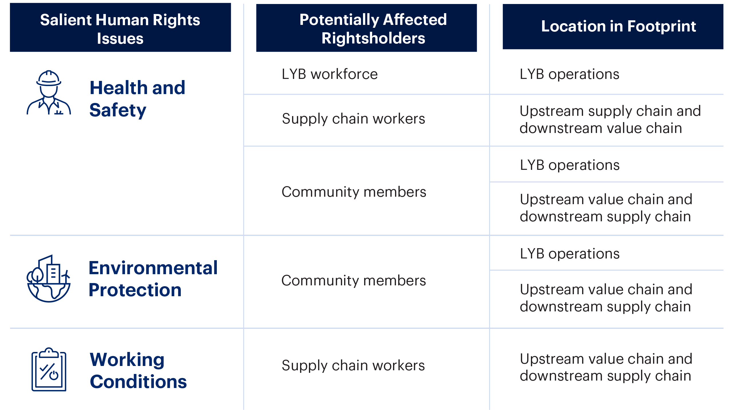 At LYB, we identify and prioritize salient human rights issues in our operations, as well as those of our direct and indirect suppliers, and joint ventures. We consider our salient human rights to be those most at risk of severe negative impact in our own operations or in our supply chain.